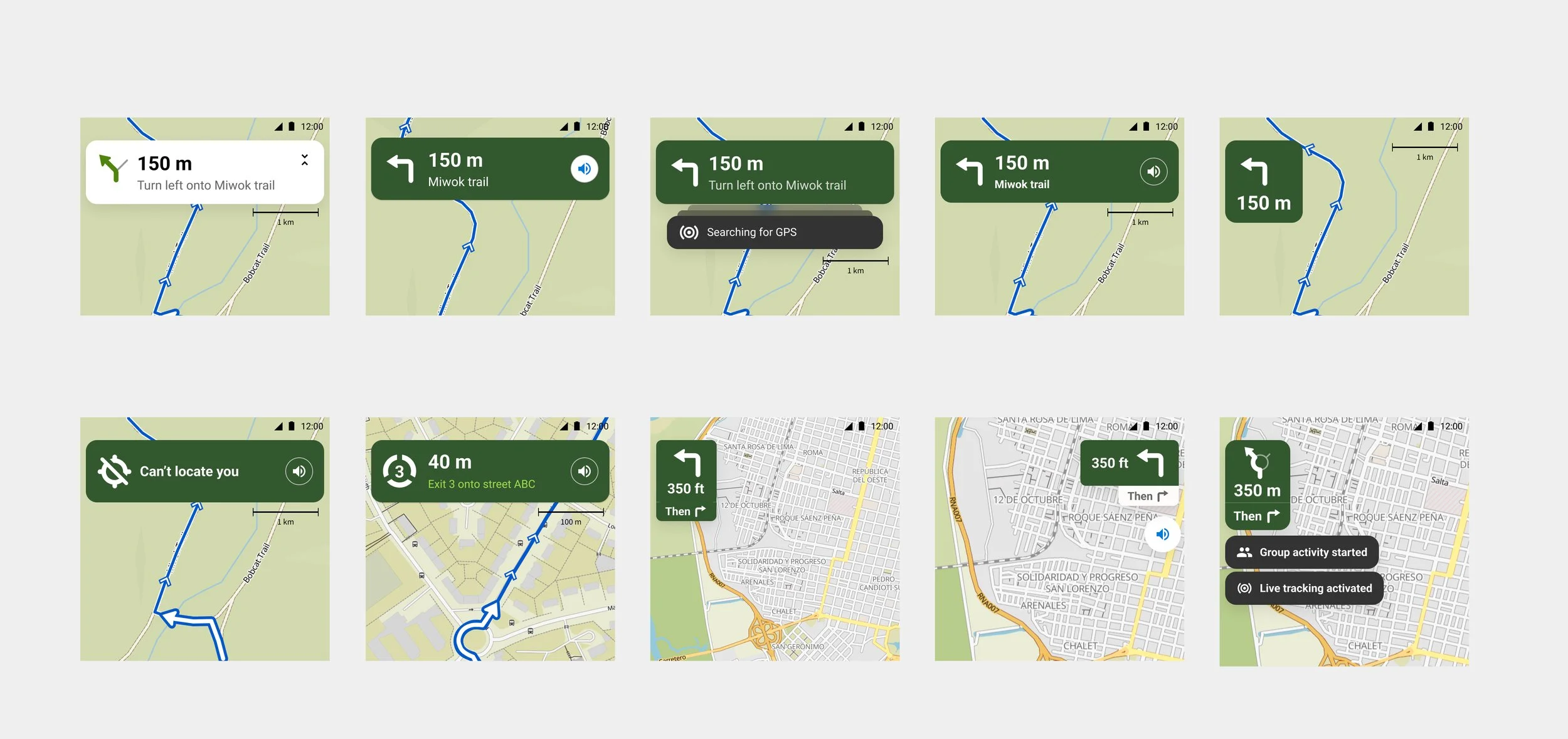 I carried forward the insight that users wanted to customise their map experience when working on the Turn by turn instruction and Activity notifications components. Through multiple design iterations I explored edge cases, various states of the panels, and associated interactions. We refined and improved messaging together with the UX writer (part-shared with other squads).